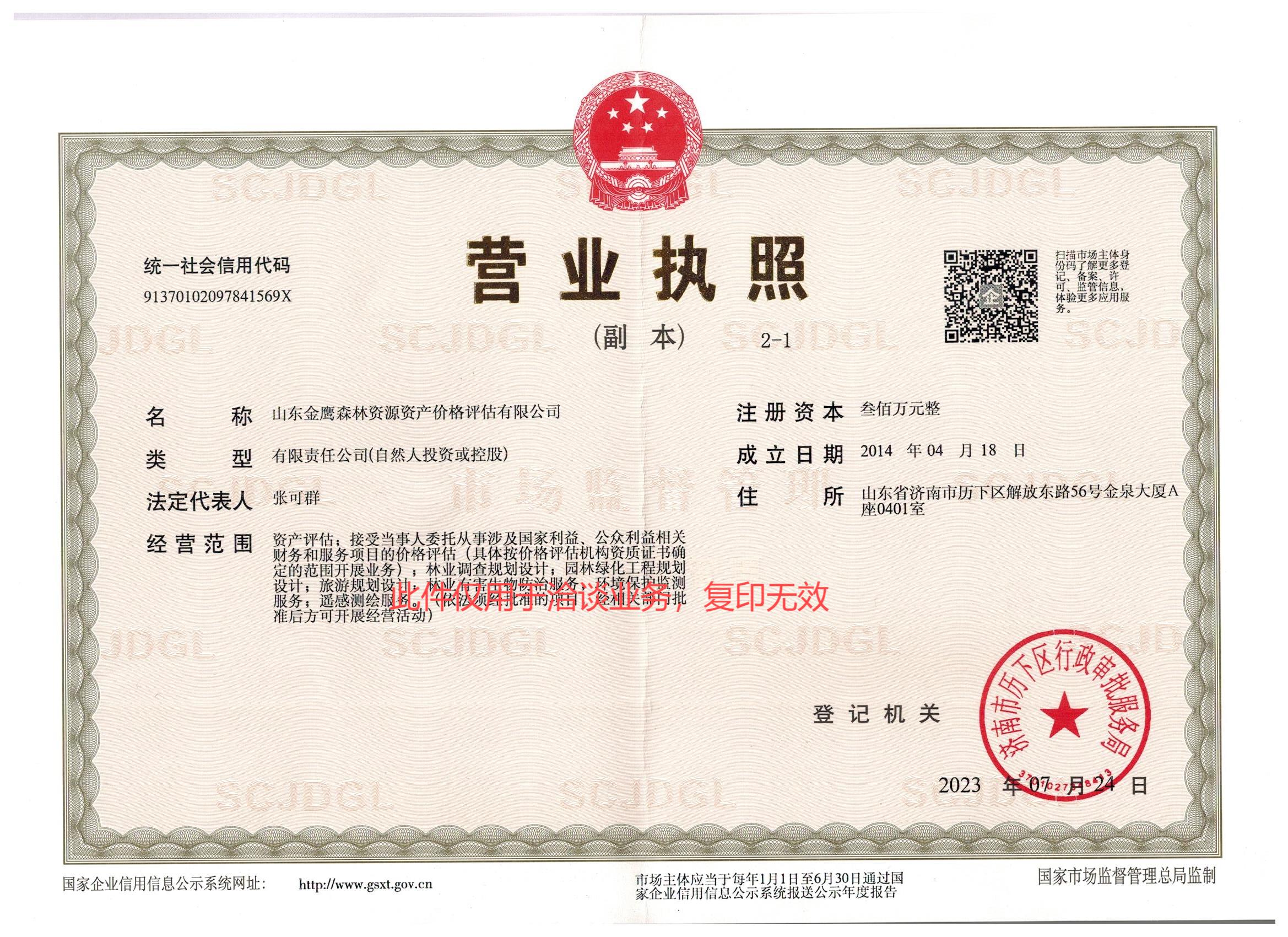 山東金鷹森林資源資產價格評估有限公司于2014年4月由山東省林業科技培訓中心立項組建成立,后注冊改為民營企業,實行公司化經營,注冊資金300萬元。本公司是經原省林業廳審核,省物價局批準頒發的第一批省內森林資源資產價格評估資格的專業機構。